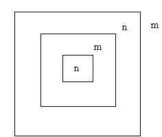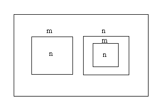 Here I have illustrated this idea using two signal values. One value is n (for not marked). The other value is m (for marked). In the expression above, we give the deepest space the value n and watch the signal bubble upward. It crosses one boundary and becomes m. Then it crosses another boundary and becomes n, and finally a third boundary and becomes m in the space of depth zero. Incidentally, I will call the space of depth zero the shallowest space.